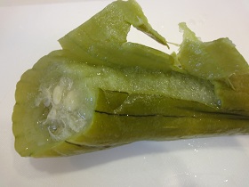 多少黄色がかってきたへちまを収穫し、鍋に入る大きさにカットし、煮ることにより、皮と果肉を取り除く方法で、 短時間で非常に手軽にできます。 収穫の時期を早めると、やわらかいものが、遅めの収穫だと固めのたわしが出来上がります。 ただし、鍋の大きさによっては、へちまをカットしなければなりません。
